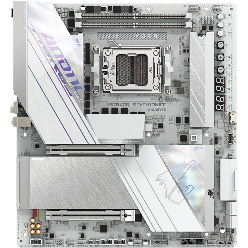 "GIGABYTE X870 AORUS TACHYON ICE Motherboard - Supports AMD Ryzen 9000 CPUs, 18+2+2 Phases Digital VRM, up to 9600Hz DDR5 (OC), 1xPCIe 5.0 + 2xPCIe 4.0, Wi-Fi 7, 5 GbE LAN, USB 4. Processor manufacturer: AMD, Processor socket: Socket AM5, Compatible processor series: AMD Ryzen 7000 Series, AMD Ryzen 8000 Series, AMD Ryzen 9000 Series. Supported memory types: DDR5-SDRAM, Maximum internal memory: 128 GB, Memory slots type: DIMM. Supported storage drive interfaces: M.2, PCI Express 4.0, PCI Express 5.0, SATA III, Supported storage drive types: HDD & SSD, RAID levels: 0, 1, 5, 10. Maximum resolution: 4096 x 2160 pixels. Ethernet interface type: 2.5 Gigabit Ethernet, 5 Gigabit Ethernet, Fast Ethernet, Gigabit Ethernet, LAN controller: Realtek RTL8126, Top Wi-Fi standard: Wi-Fi 7 (802.11be)"\n"Elevate your computing experience with GIGABYTE's renowned motherboard series: AORUS, AERO, and GIGABYTE. Featuring innovative designs and advanced features, these boards offer exceptional performance and reliability. Whether you're a gamer, content creator, or professional, our series cater to your needs, ensuring uncompromising quality and cutting-edge technology."
