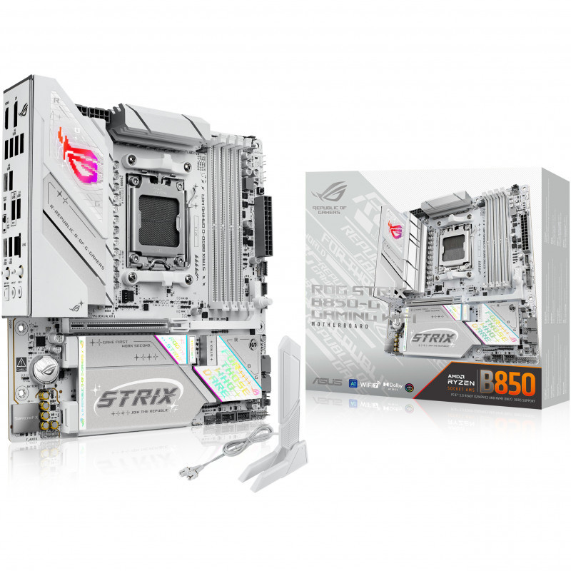 "ASUS ROG STRIX B850-G GAMING WIFI. Processor manufacturer: AMD, Processor socket: Socket AM5, Compatible processor series: AMD Ryzen 7000 Series, AMD Ryzen 8000 Series, AMD Ryzen 9000 Series. Supported memory types: DDR5-SDRAM, Maximum internal memory: 256 GB, Memory slots type: DIMM. Supported storage drive interfaces: M.2, SATA III, Supported storage drive types: HDD & SSD, RAID levels: 0, 1, 5, 10. Ethernet interface type: 2.5 Gigabit Ethernet, Top Wi-Fi standard: Wi-Fi 7 (802.11be), Wi-Fi standards: Wi-Fi 7 (802.11be). Component for: PC, Motherboard form factor: micro ATX, Motherboard chipset family: AMD"\n"ASUS ROG Strix B850-G Gaming WiFi AMD mATX motherboard, 14+2+1 power stages, DDR5 slots, four M.2 slots, PCIe® 5.0, WiFi 7, USB 20Gbps Type-C® and Aura Sync RGB"