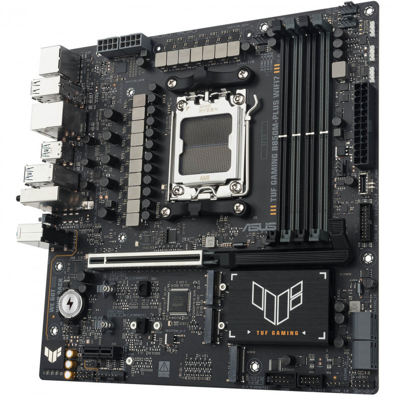 "ASUS TUF GAMING B850M-PLUS WIFI7. Processor manufacturer: AMD, Processor socket: Socket AM5, Compatible processor series: AMD Ryzen 7000 Series, AMD Ryzen 8000 Series, AMD Ryzen 9000 Series. Supported memory types: DDR5-SDRAM, Maximum internal memory: 256 GB, Memory slots type: DIMM. Supported storage drive interfaces: PCI Express 4.0, PCI Express 5.0, Supported storage drive types: HDD & SSD, RAID levels: 0, 1, 5, 10. Ethernet interface type: 2.5 Gigabit Ethernet, Top Wi-Fi standard: Wi-Fi 7 (802.11be), Wi-Fi standards: Wi-Fi 7 (802.11be). Component for: PC, Motherboard form factor: micro ATX, Motherboard chipset family: AMD"\n"ASUS TUF GAMING B850M-PLUS WIFI7 takes all the essential elements of the latest AMD Ryzen™ processors and combines them with game-ready features and proven durability. Engineered with military-grade components, an upgraded power solution and a comprehensive cooling system, this motherboard goes beyond expectations with rock-solid and stable performance for marathon gaming. TUF GAMING motherboards also undergo rigorous endurance testing to ensure that they can handle conditions where others may fail. This platform delivers the power and connectivity that advanced AI PC applications demand.
