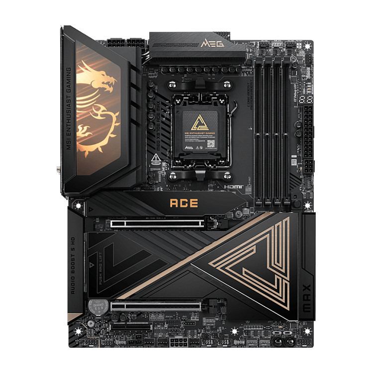 "MSI MEG X870E ACE MAX. Processor manufacturer: AMD, Processor socket: Socket AM5, Compatible processor series: AMD Ryzen 7000 Series, AMD Ryzen 8000 Series, AMD Ryzen 9000 Series. Supported memory types: DDR5-SDRAM, Maximum internal memory: 256 GB, Memory slots type: DIMM. Supported storage drive interfaces: M.2, SATA III, Supported storage drive types: HDD & SSD, RAID levels: 0, 1, 10. Ethernet interface type: 5 Gigabit Ethernet, Top Wi-Fi standard: Wi-Fi 7 (802.11be), Wi-Fi standards: 802.11a, 802.11b, 802.11g, Wi-Fi 4 (802.11n), Wi-Fi 5 (802.11ac), Wi-Fi 6 (802.11ax), Wi-Fi 6E.... Component for: PC, Motherboard form factor: ATX, Motherboard chipset family: AMD"\n"The MEG X870E ACE MAX boasts premium aesthetics with a sleek black metal nameplate and polished gold accents, symbolizing high-quality materials and construction that evoke a sense of prestige. Constructed around the latest AMD X870E chipset which supports AMD Ryzen 9000/8000/7000 series processors, featuring OC Engine, PCIe 5.0, 10G + 5G LAN, USB4, Wi-Fi 7, premium Frozr and EZ DIY design, setting a new standard for AMD X870E motherboards.
