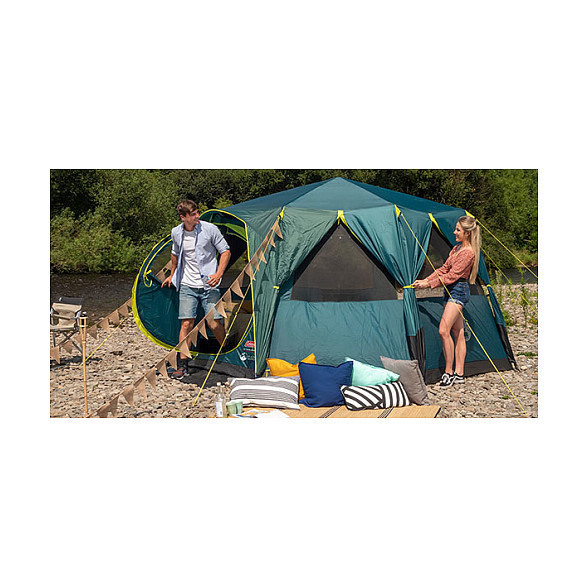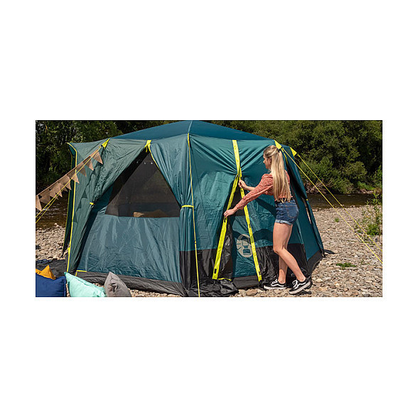 "Coleman Octagon. Number of sleeping places: 8 person(s), Frame type: Hard frame, Total area: 15.7 m². Purpose: Camping, Product colour: Green, Yellow, Number of doors: 1 door(s). Ground cloth material: Polyethylene, Interior material: Polyester, Exterior finish material: Polyester. Width: 3960 mm, Depth: 3860 mm, Weight: 20.6 kg. Package width: 850 mm, Package depth: 320 mm, Package height: 280 mm"\n"One of our most beloved tents has evolved to encompass Coleman's® patented BlackOut Bedroom® design. The Octagon BlackOut provides a full 360° view of your surroundings. Ample living space and the ingenious hinged door gives it a homely feel on the campsite.