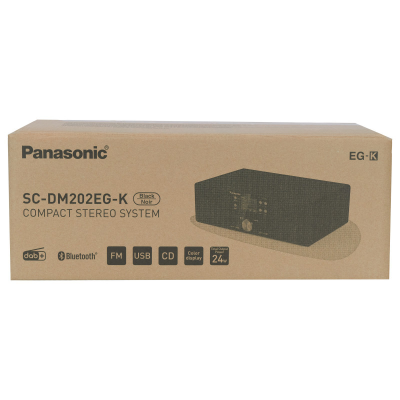 "Panasonic SC-DM202EG-K. Type: Home audio micro system, Product colour: Black, Disc loading type: Front. RMS rated power: 24 W, Speaker type: Full range, Speakers connectivity type: Wireless. Supported radio bands: DAB+, Tuner enhancements: Auto tuning, Tuner type: Digital. Display type: TFT, Backlight colour: Blue. Headphone connectivity: 3.5 mm, Power source type: AC"\n"Panasonic’s DM202’a All-in-One Stereo System is for those who appreciate high-quality music and audio entertainment, but don't want to worry about extra wires or speakers. Contained within the elegant wooden outer-casing are a pair of stereo speakers, a DAB+ and FM radio, as well as CD player.