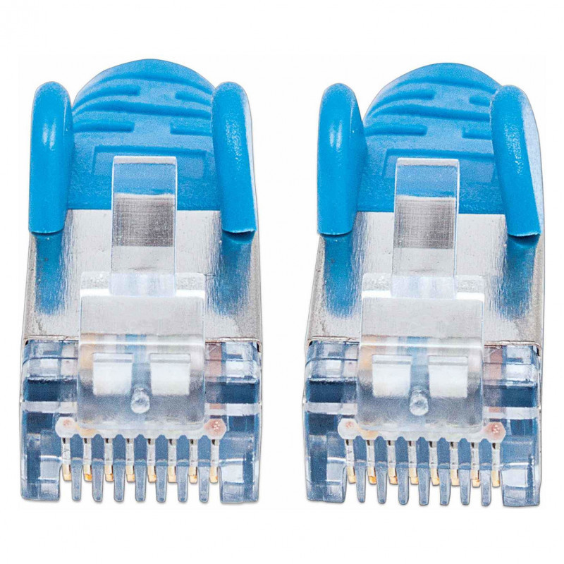 "Intellinet Network Patch Cable, Cat7 Cable/Cat6A Plugs, 0.5m, Blue, Copper, S/FTP, LSOH / LSZH, PVC, RJ45, Gold Plated Contacts, Snagless, Booted, Lifetime Warranty. Cable length: 0.5 m, Cable standard: Cat7, Cable shielding: S/FTP (S-STP), Connector 1: RJ-45, Connector 2: RJ-45, Connector contacts plating: Gold, Data transfer rate: 10000 Mbit/s, Product colour: Blue"\n"Cat7 raw cable with Cat6a modular plugs gives the best performance for your network infrastructure.Why Cat6a modular plugs?As there is no official, agreed-upon standard for the Cat7 plug, Intellinet Network Solutions uses the highest official TIA/EIA-approved components to give you the best specification available."