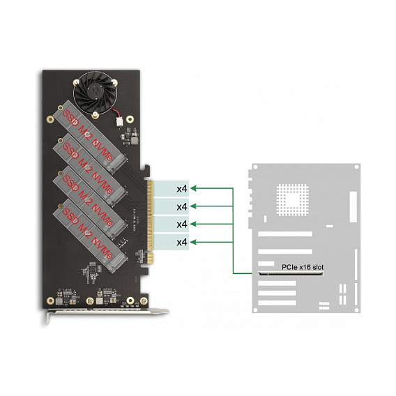 "DeLOCK PCI Express 4.0 x16 Card to 4 x internal NVMe M.2 Key M with Heat Sink and Fan - Bifurcation. Host interface: PCIe, Output interface: M.2, Expansion card standard: PCIe 4.0. Product colour: Grey, Number of fans: 1 fan(s), Country of origin: China. Windows operating systems supported: Windows 10, Windows 10 x64, Windows 11, Windows 8.1, Windows 8.1 x64, Linux operating systems supported: Linux Kernel 5.8, Server operating systems supported: Windows Server 2019. Width: 95 mm, Depth: 238 mm, Height: 8 mm. Quantity per pack: 1 pc(s), Package type: Box"\n"This PCI Express card by Delock expands the PC by four M.2 slots. Up to four M.2 SSDs in format 2280, 2260, 2242 and 2230 can be connected. With the help of the large heat sink and the fan, sufficient cooling of the M.2 modules is guaranteed.