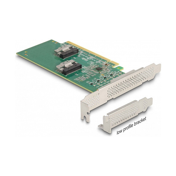 "DeLOCK PCI Express 4.0 x16 Card to 4 x SFF-8639 NVMe - Bifurcation - Low Profile Form Factor. Host interface: PCIe, Output interface: U.2. Data transfer rate (max): 64 Gbit/s. Windows operating systems supported: Windows 10, Windows 7, Windows 8.1, Server operating systems supported: Windows Server 2016. Package type: Box"\n"This PCI Express card by Delock expands the PC by four SFF-8639 interfaces. SSDs with e.g. U.2 interface can be connected to these ports.