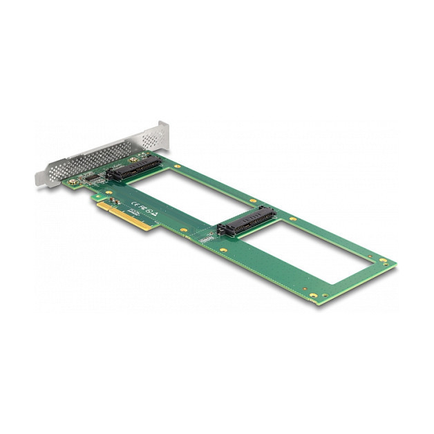 "DeLOCK PCI Express 4.0 x8 Card to 2 x internal SFF-8654 4i NVMe - Bifurcation - Low Profile Form Factor. Host interface: PCIe, Output interface: SFF-8654, Expansion card form factor: Low-profile. Product colour: Stainless steel, Country of origin: China. Connector 1 gender: Female, Connector 2 gender: Female, Data transfer rate (max): 64 Gbit/s. Windows operating systems supported: Windows 10, Windows 10 x64, Windows 8.1, Windows 8.1 x64, Linux operating systems supported: Linux Kernel 5.8, Server operating systems supported: Windows Server 2019. Quantity per pack: 1 pc(s), Package type: Box"\n"This PCI Express card by Delock expands the PC by two SFF-8654 interfaces. SSDs with e.g. U.2 interface can be connected to these ports by using an optional cable. The card transmits PCI Express signals using the NVMe protocol.