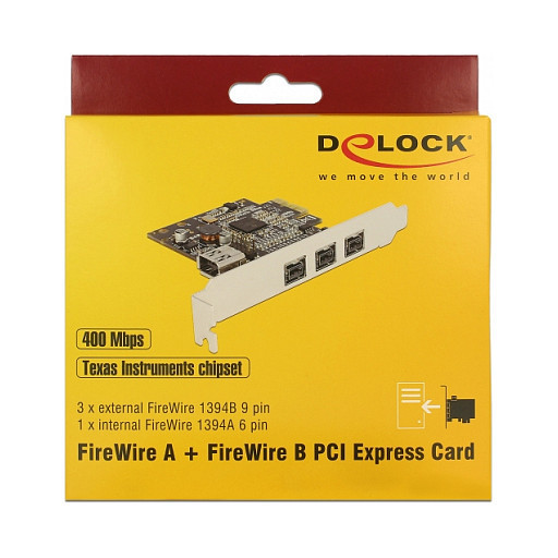 "DeLOCK 89864. Host interface: PCIe, Output interface: IEEE 1394/Firewire. Product colour: Black, Grey, Country of origin: China. Chipset: Texas Instruments, Data transfer rate (max): 0.8 Gbit/s. Package type: Box"\n"This PCI Express card by Delock expands the PC by three external FireWire 800 ports as well as one internal FireWire 400 port. Different FireWire devices such as external enclosure, digital cameras, camcorders, adapters etc. can be connected to this card."