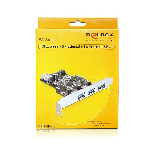"DeLOCK 89301. Host interface: PCIe, Output interface: USB 3.2 Gen 1 (3.1 Gen 1). Purpose: PC. Chipset: VLI. Windows operating systems supported: Windows 7 Home Premium, Windows 7 Home Premium x64, Windows 7 Professional, Windows 7 Professional.... Data transfer rate: 5 Gbit/s, Connectivity technology: Wired"\n"The Delock PCI Express card expands your PC by three external USB 3.0 ports as well as one internal USB 3.0 port. You can connect USB 3.0 devices like e.g. docking station, card reader, external enclosure etc. to the card. Since the USB-A interface is compatible to its forerunners USB 2.0 and USB 1.1, you can still use your existing USB devices."