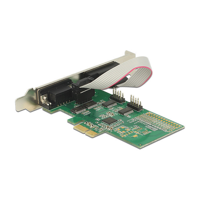 "DeLOCK 89557. Host interface: PCIe, Output interface: Serial, Expansion card form factor: Low-profile. Product colour: Green, Country of origin: China. Chipset: ASIX AX99100, Data transfer rate (max): 0.0002304 Gbit/s, FIFO (First In, First Out): 256 B. Windows operating systems supported: Windows 10 Education, Windows 10 Education x64, Windows 10 Enterprise, Windows 10 Enterprise x64,.... Package type: Hanging box"\n"The PCI Express card by Delock expands a PC by four external serial ports. Different devices such as scanner, printer, mouse etc. can be connected to this card. By using the included low profile brackets, the PCI Express card can be also installed into a Mini-PC."