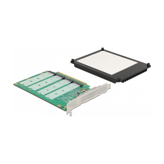 "DeLOCK PCI Express x16 Card to 4 x internal NVMe M.2 Key M with heat sink - Bifurcation. Host interface: PCIe, Output interface: M.2, Expansion card standard: PCIe 4.0. Product colour: Black, Purpose: PC, Cooling type: Passive. Windows operating systems supported: Windows 10, Windows 8.1, Server operating systems supported: Windows Server 2016. Package type: Box"\n"This PCI Express card by Delock expands the PC by four M.2 slots. Up to four M.2 SSDs in format 2280, 2260, 2242 and 2230 can be connected. With the help of the large heat sink sufficient cooling of the M.2 modules is guaranteed.