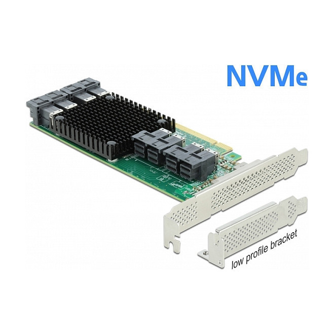"DeLOCK PCI Express x16 Card to 8 x internal SFF-8643 NVMe - Low Profile Form Factor. Host interface: PCIe, Output interface: Mini-SAS, Expansion card form factor: Low-profile. Cooling type: Passive. Data transfer rate (max): 32 Gbit/s. Server operating systems supported: Windows Server 2019. Package type: Box"\n"This PCI Express card by Delock expands the PC by eight SFF-8643 interfaces. SSDs with e.g. U.2 interface can be connected to these ports by using an optional cable."