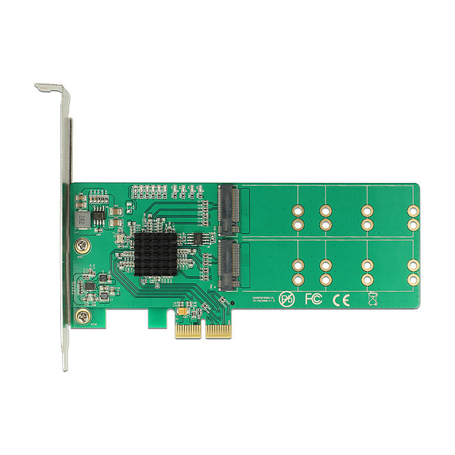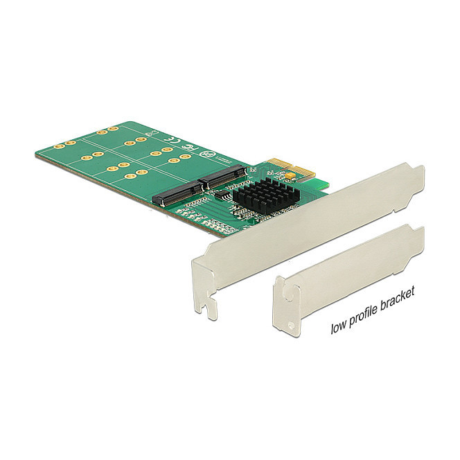 "DeLOCK 89588. Host interface: PCIe, Output interface: SATA, Expansion card form factor: Low-profile. Windows operating systems supported: Windows 10, Windows 7, Windows 8.1. Package type: Box. Housing colour: Green, Metallic"\n"This PCI Express card by Delock expands the PC by four M.2 slots. Up to four M.2 SATA modules can be connected in format 2280, 2260, 2242, 2230 with this card."