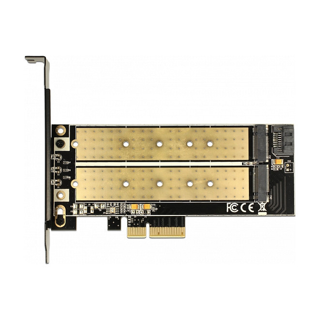"DeLOCK 89630. Host interface: PCIe, Output interface: M.2, SATA. Cooling type: Passive, Country of origin: China. Windows operating systems supported: Windows 10, Windows 7, Windows 8, Windows 8.1. Package type: Hanging box"\n"This PCI Express card by Delock expands the PC by two M.2 slots. One M.2 SATA module can be connected in format 22110, 2280, 2260, 2242, 2230 with this card and connected via SATA cable to the motherboard. Additionally, one M.2 PCIe module in format 22110, 2280, 2260, 2242, 2230 can be connected. Both slots can be used at the same time."