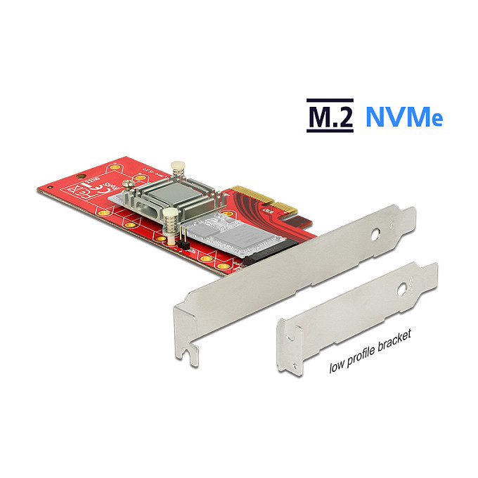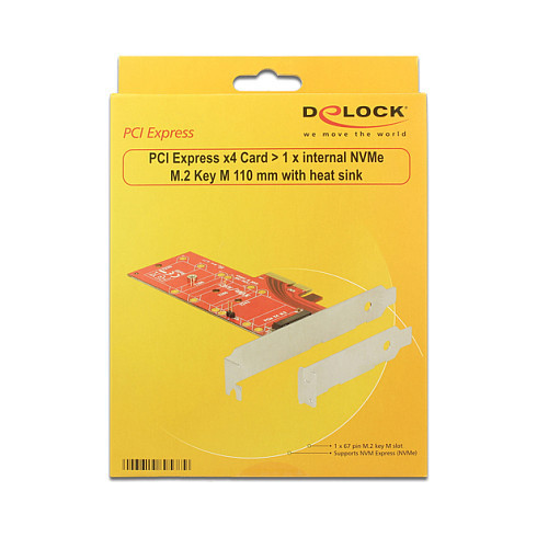 "DeLOCK 89577. Host interface: PCIe, Output interface: M.2, Expansion card standard: PCIe 3.0. Product colour: Black, Red, Silver. Data transfer rate (max): 39 Gbit/s. Windows operating systems supported: Windows 10 Education, Windows 10 Education x64, Windows 10 Enterprise, Windows 10 Enterprise x64,.... Package type: Box"\n"This PCI Express card by Delock expands the PC by one M.2 slot. An M.2 SSD in format 22110, 2280, 2260 and 2242 can be connected. By the heat sink, which can be positioned on different applicable positions, can be ensured a good heat dissipation of the memory module."