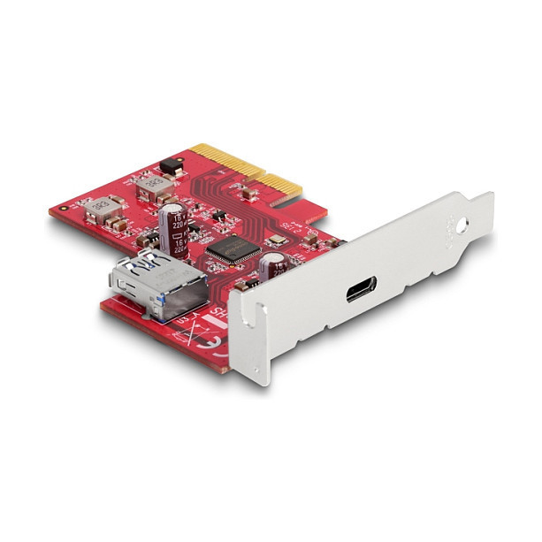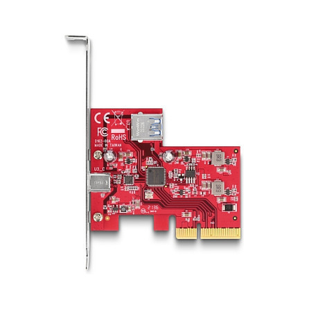 "DeLOCK PCI Express x4 Card to 1 x external USB 10 Gbps USB Type-C female + 1 x internal USB 10 Gbps Type-A female - Low Profile Form Factor. Host interface: PCIe, Output interface: USB 3.2 Gen 2 (3.1 Gen 2), USB Type-C. Data transfer rate (max): 10 Gbit/s. Output voltage: 5 V, Output current: 3 A. Quantity per pack: 1 pc(s), Package type: Box"\n"This PCI Express card by Delock expands the PC by two USB 10 Gbps ports. Different USB devices such as USB flash memory, card reader, external enclosure etc. can be connected. The card allows a data transfer rate of 10 Gbps on both ports when used simultaneously."