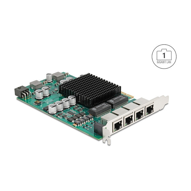 "DeLOCK PCI Express x4 Network Card Gigabit LAN 4 x RJ45 with PoE+ i350. Internal. Connectivity technology: Wired, Host interface: PCI Express, Interface: Ethernet. Maximum data transfer rate: 1000 Mbit/s. Product colour: Green, Stainless steel"\n"The PCI Express card by Delock offers four network ports with a data transfer rate up to 1000 Mbps.