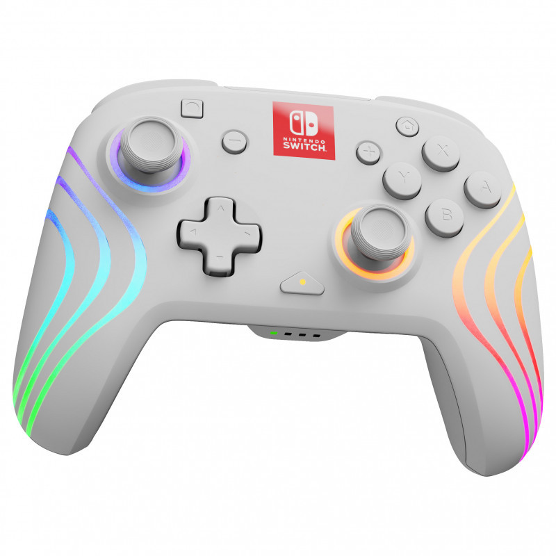 "PDP Afterglow Wave. Device type: Gamepad, Gaming platforms supported: Nintendo Switch, Nintendo Switch OLED, Gaming control function buttons: D-pad, Home button. Connectivity technology: Wireless, Wireless range: 9.1 m. Product colour: White. Power source: Battery, Battery type: Built-in, Battery capacity: 2100 mAh. Package type: Box"\n"Make waves with the vibrant colors and combinations of the Afterglow Wave Wireless Controller's eight RBG lighting zones and four pre-set modes. With a built-in, 2100mAh rechargeable battery you won't need to purchase single-use batteries, so you can save the planet and your bank account. You'll need to call it quits before the controller with up to a 40-hour battery life. Get comfy on the couch for a long day of gaming with the 30-foot wireless range. Take down enemies quickly and efficiently by mapping controller functions to the two programmable back buttons. See your gaming in a new light with the officially licensed Afterglow Wave Wireless Controller for Nintendo Switch™.