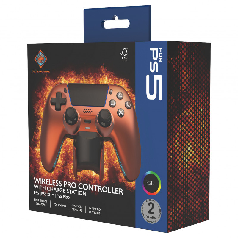 "Deltaco Gaming GAM-199-ORANGECOPPER. Device type: Gamepad, Gaming platforms supported: PlayStation 5, PC, Android, iOS, Gaming control function buttons: Home button, D-pad, Share button, Options button, Reset button. Connectivity technology: Wired & Wireless, Device interface: Bluetooth/USB, USB connector type: USB Type-C. Product colour: Orange, Bronze, Housing material: Acrylonitrile butadiene styrene (ABS). Power source: Cable/Battery, Battery technology: Lithium, Battery capacity: 1000 mAh. Width: 160 mm, Depth: 63 mm, Height: 110 mm"\n"Upgrade your gameplay with the Wireless Pro Controller for PS5, designed for players who want more control, more style, and more performance.