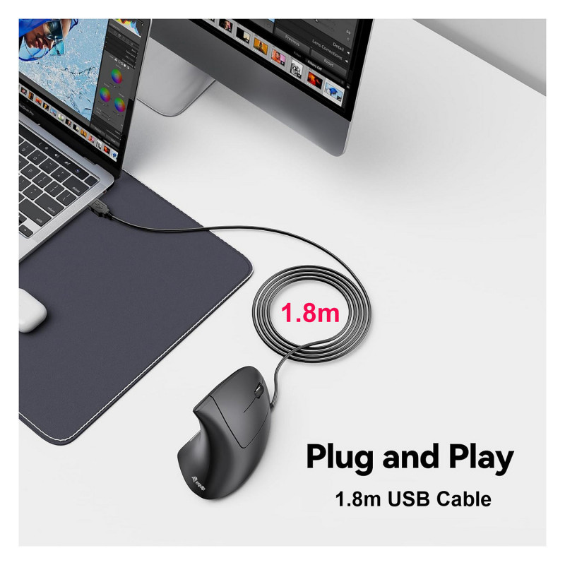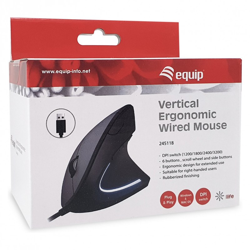 "Equip 245118. Form factor: Right-hand, Vertical design. Movement detection technology: Optical, Device interface: USB Type-A, Movement resolution: 3200 DPI, Buttons type: Pressed buttons, Buttons quantity: 6, Scroll type: Wheel. Illumination colour: Blue. Power source: Cable. Product colour: Black"\n"The Equip 245118 Vertical Ergonomic Wired Mouse is designed to provide optimal comfort and support for your hand, wrist, and forearm, making it an ideal choice for long hours of computer use. Unlike traditional mice, this vertical design promotes a natural handshake position that helps reduce strain and prevent repetitive stress injuries like carpal tunnel syndrome. Its contoured shape fits comfortably in your hand, allowing for precise control with minimal effort.