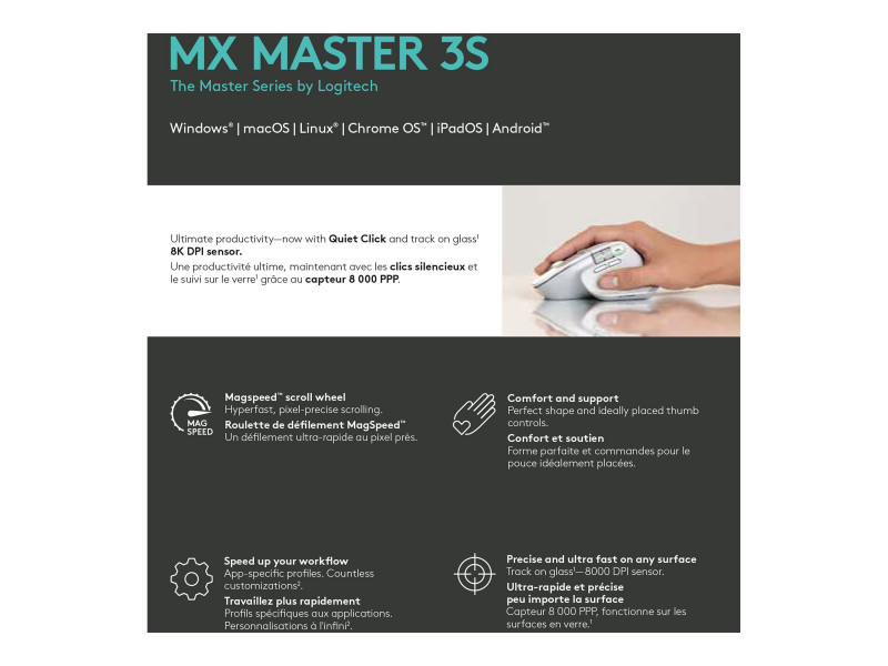 Logitech Mouse | MX MASTER 3S | Wireless | Bluetooth, 2.4GHz | Pale Gray
