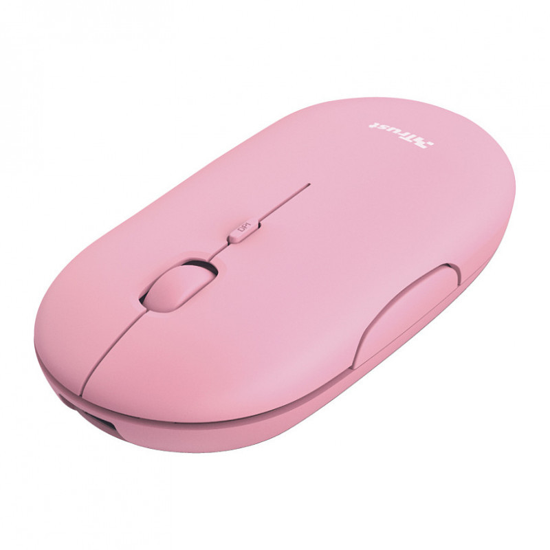 "Trust Puck. Form factor: Ambidextrous. Movement detection technology: Optical, Device interface: RF Wireless + Bluetooth, Movement resolution: 1600 DPI, Buttons type: Pressed buttons, Buttons quantity: 4, Scroll type: Wheel. Power source: Batteries. Product colour: Pink"\n"Minimalistic Design, Maximum Features