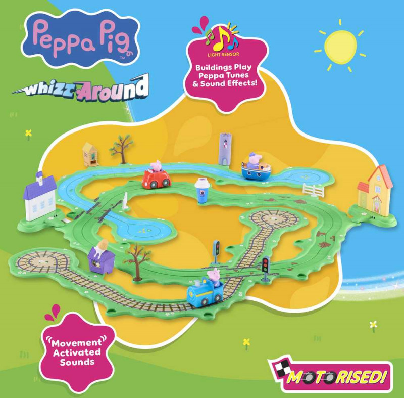 Peppa Pig Whizz-Around is a beautifully designed and colourful track and vehicle toy set that brings Peppa's world to life in a new way! Sturdy motorised cars featuring Peppa and her friends in their favourite vehicles. Press the top and watch them go! They are specially designed to be used with the Peppa Pig Whizz-Around track system. Some of them can activate secret sounds in larger sets. The vehicles also work on any smooth surface - just press the top and watch them go! |