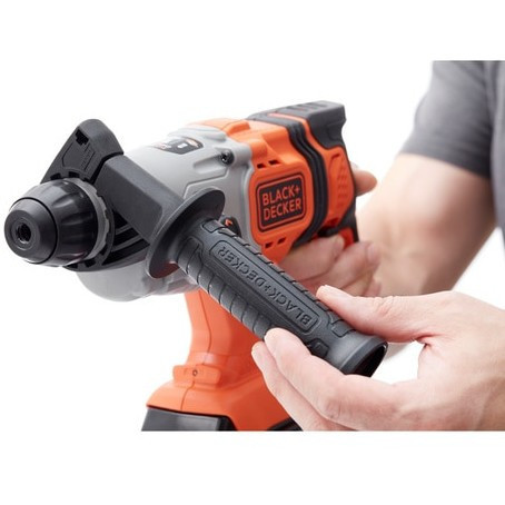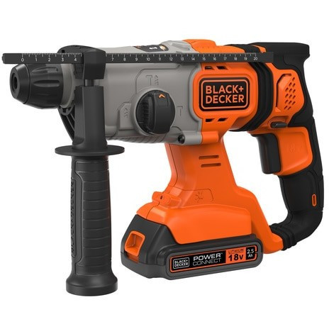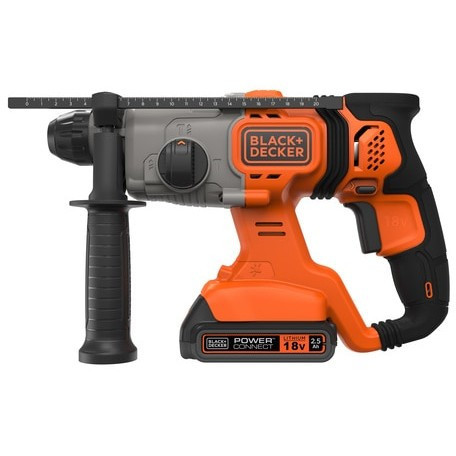 "Black & Decker BCD900E2K-QW. Product design: Pistol grip drill, Chuck type: SDS Plus. Chuck capacity (max): 2.5 cm, Idle speed (max): 1880 RPM, Drilling diameter in wood (max): 2.5 cm. Power source: Battery, Battery capacity: 2.5 Ah, Battery voltage: 18 V. Number of batteries included: 2 pc(s), Number of drill bits: 1 pc(s)"\n"Part of the 18V POWERCONNECT™ interchangeable battery system this 18V SDS-Plus Hammer Drill delivers long lasting power without the hassle of a cord. You can quickly change between the three drilling and hammer modes to suit the task at hand, and the 1.2J motor delivers high impact energy making it easier to complete tasks.