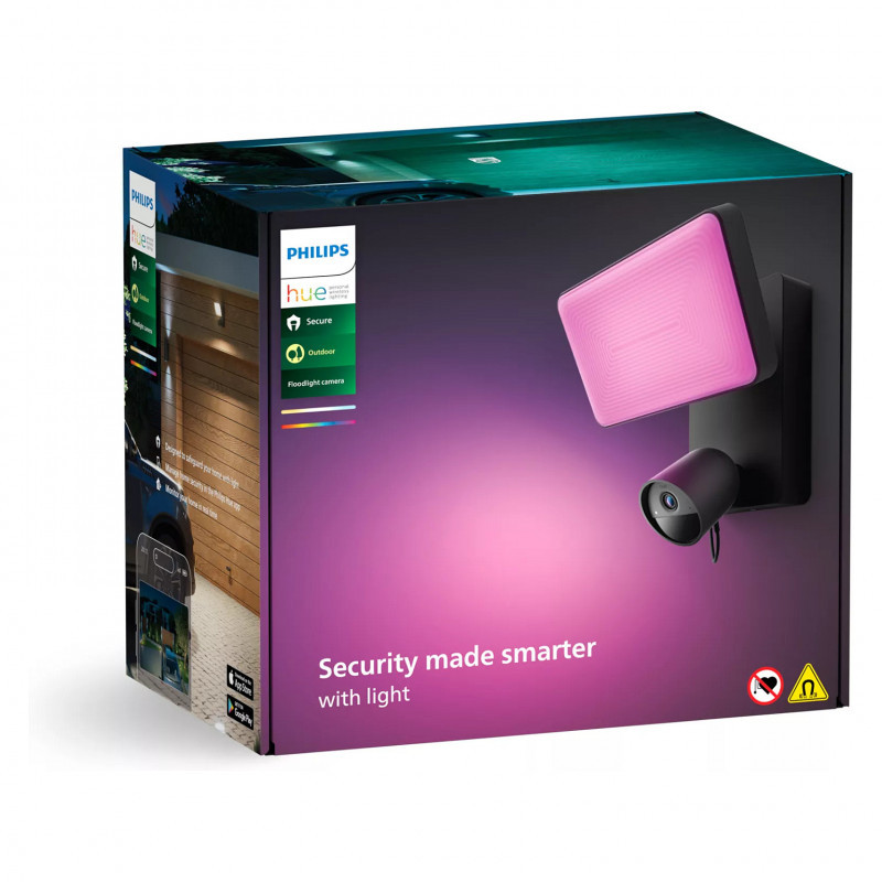"Philips Hue Secure Flood Light Camera. Type: IP security camera, Placement supported: Outdoor, Connectivity technology: Wireless. Mounting type: Wall, Product colour: Black, Form factor: Bullet. Field of view (FOV) angle: 141.2°. Sensor type: CMOS. LED type: IR"\n"Easy smart lighting