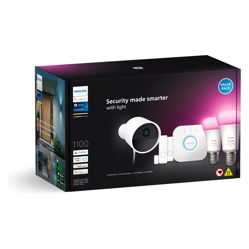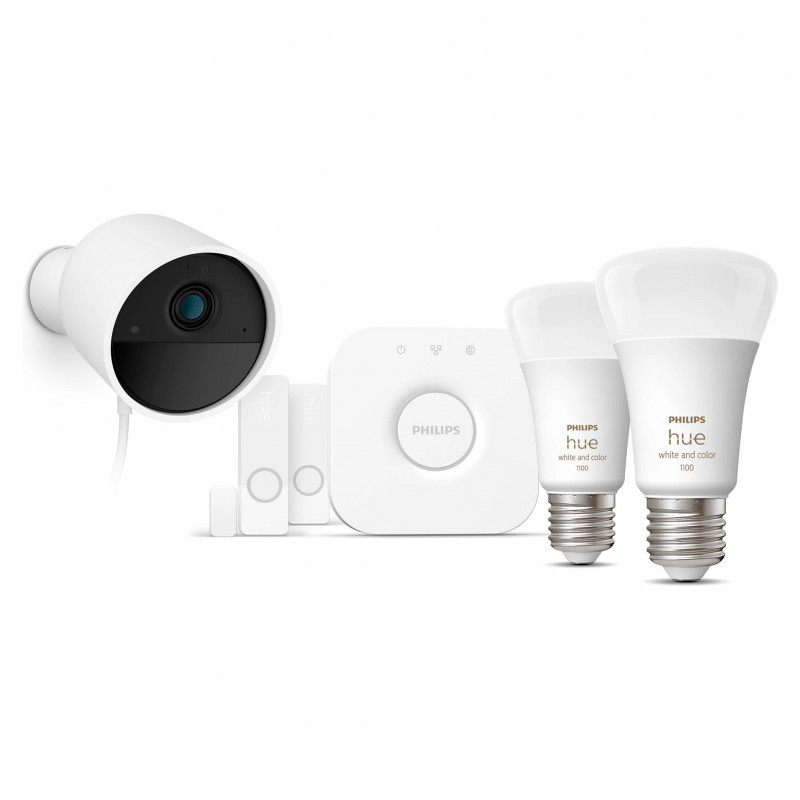 "Philips Secure starter kit with camera. Type: Smart lighting kit, Interface: Bluetooth/Zigbee, Product colour: White. Power consumption (standby): 0.5 W, Power consumption (max): 9 W, Input voltage: 220-240 V. Height: 110 mm, Diameter: 6 cm, Hue bridge width: 8.8 cm. Package width: 1760 mm, Package depth: 2920 mm, Package height: 1400 mm. Cables included: LAN (RJ-45), Number of hue bulb(s) included: 2 bulb(s)"\n"Easy smart lighting
