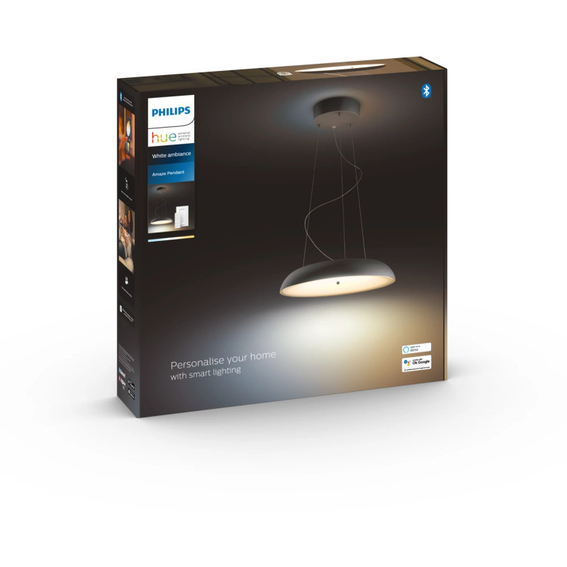"Philips Hue White ambience Amaze suspension light. Type: Smart suspension light, Interface: Bluetooth, Product colour: Black. Energy efficiency class: F, Input voltage: 50–60 Hz, Bulb voltage: 24 V. Width: 434 mm, Depth: 434 mm, Height: 77 mm. Package width: 456 mm, Package depth: 476 mm, Package height: 100 mm. Quantity per pack: 1 pc(s)"\n
