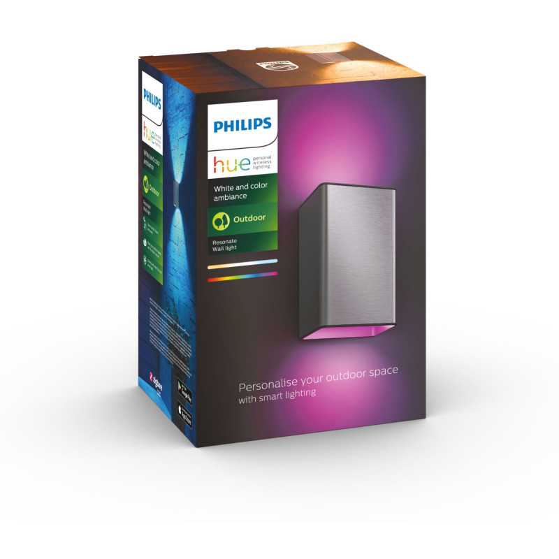 "Philips Hue White and colour ambience Resonate Outdoor wall light. Type: Outdoor wall lighting, Interface: Bluetooth, Product colour: Stainless steel. Energy efficiency class: G, Power source type: AC, Input voltage: Interall 220–240 . Width: 93 mm, Depth: 120 mm, Height: 180 mm. Package width: 155 mm, Package depth: 125 mm, Package height: 220 mm. Quantity per pack: 1 pc(s)"\n"Limitless possibilities