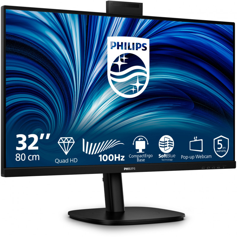 "Philips 3000 series 32B2U3601H/00. Display diagonal: 80 cm (31.5""), Display resolution: 2560 x 1440 pixels, HD type: Quad HD, Display technology: LCD, Response time: 4 ms, Native aspect ratio: 16:9, Viewing angle, horizontal: 178°, Viewing angle, vertical: 178°. Built-in speaker(s). Built-in USB hub, USB hub version: 3.2 Gen 1 (3.1 Gen 1). VESA mounting, Height adjustment. Product colour: Black"\n"Speed through daily tasks in comfort with this monitor's SoftBlue technology and 100 Hz refresh rate. Productivity-enhancing features like USB-C and pop-up webcam with Windows Hello deliver the performance and convenience you expect."