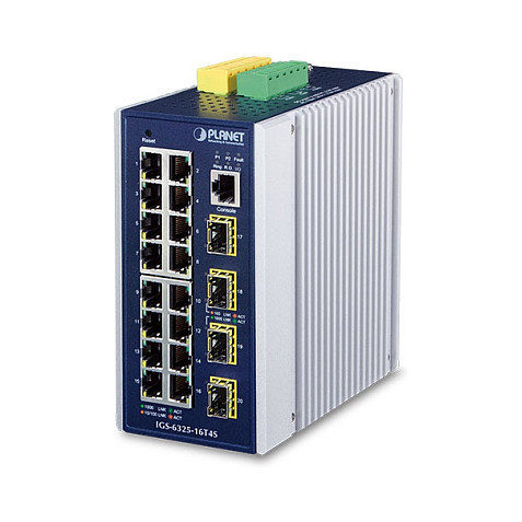 "PLANET IGS-6325-16T4S. Switch type: Managed, Switch layer: L3. Basic switching RJ-45 Ethernet ports type: Gigabit Ethernet (10/100/1000), Basic switching RJ-45 Ethernet ports quantity: 16, Console port: RJ-45. Full duplex. MAC address table: 16000 entries, Switching capacity: 40 Gbit/s. Networking standards: IEEE 802.1D, IEEE 802.1Q, IEEE 802.1ag, IEEE 802.1p, IEEE 802.1s, IEEE 802.1w, IEEE 802.1x, IEEE.... DC input voltage: 9 - 48 V. Wall mountable"\n"High-capacity Unit for Factory and Metropolitan Long-reach Networking