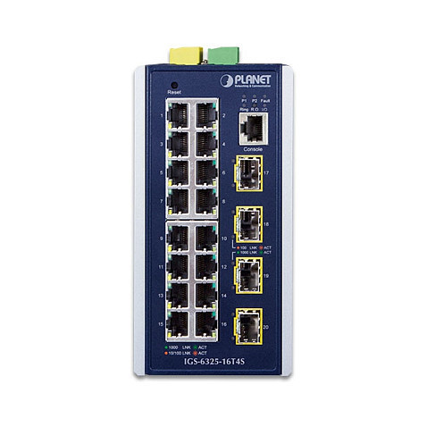 PLANET IGS-6325-16T4S is the smallest yet high-capacity, industrial-grade Layer 3 managed switch with high-density hybrid copper and fiber optic interfaces. It features 16 10/100/1000BASE-T RJ45 ports and 4 100/1000BASE-X SFP slots in a DIN-rail type rugged case and can operate stably under the temperature range from -40 to 75 degrees C.