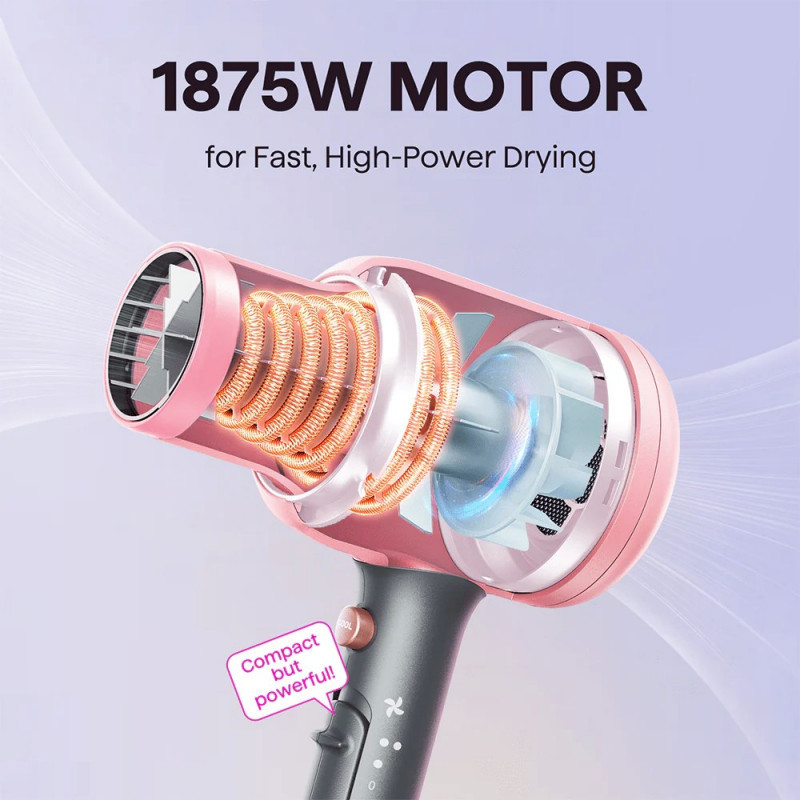 Galingas variklis (1875 W): labai efektyviai ir greitai išdžiovina plaukus — džiovinimo laikas gali būti sumažintas perpus lyginant su tradiciniais džiovintuvais.