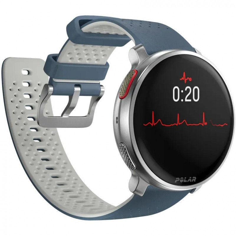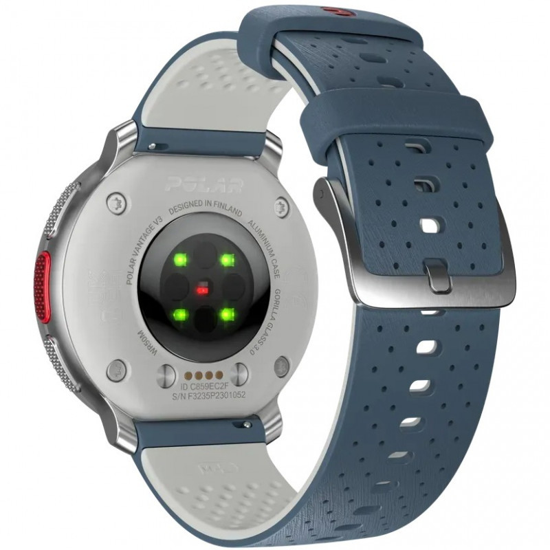 "Polar Vantage V 3 Vantage V3. Display diagonal: 3.53 cm (1.39""), Display technology: AMOLED, Display resolution: 454 x 454 pixels, Touchscreen. Processor frequency: 275 MHz, Flash memory: 32 GB. GPS (satellite). Battery capacity: 488 mAh. Weight: 57 g. Band colour: Blue, Band size: One Size"\n"An ensemble of biosensing instruments, AMOLED display, dual-frequency GPS, maps, and the most comprehensive suite of training and recovery tools on the market. The stage is set, and the Polar Vantage V3 smart sports watch is ready to put in the performance of a lifetime.