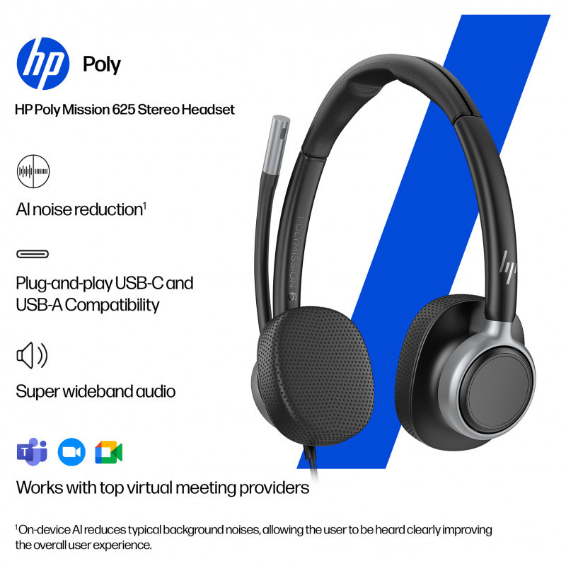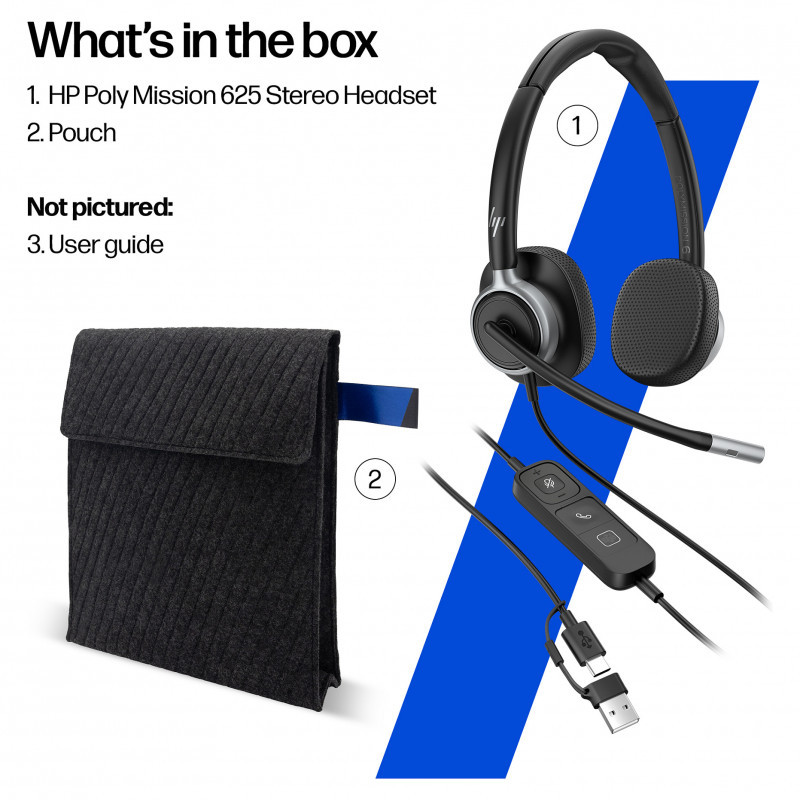 "HP Poly Mission 625 Stereo USB Wired Headset (Bulk). Weight: 147 g"\n"Comfort meets performance