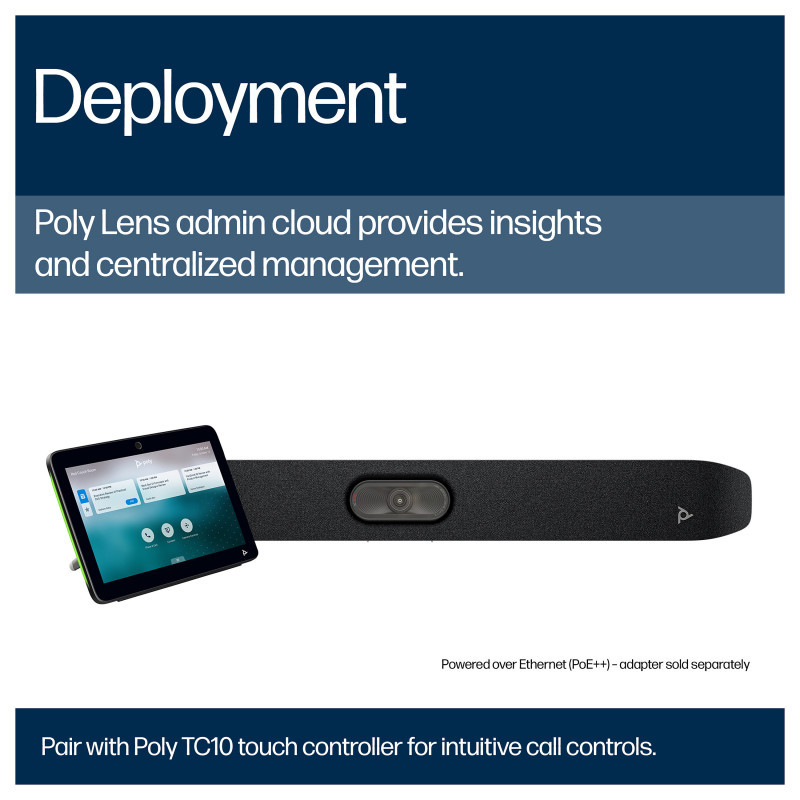 "HP Poly Studio X32 All-In-One Video Bar No Power Supply. Product type: Video collaboration bar. Total megapixels: 20 MP, HD type: 4K Ultra HD, Supported video modes: 720p, 1080p, Maximum frame rate: 30 fps. Digital zoom: 5x. Ethernet LAN, Wi-Fi. Bluetooth, Product colour: Black"\n"Unleash big connections in small spaces
