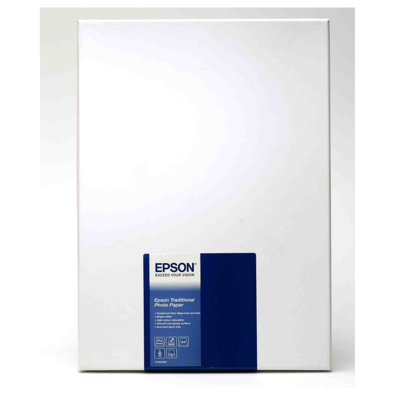 "Epson Traditional Photo Paper, DIN A4, 330g/m², 25 Sheets. Media weight: 330 g/m², Paper size: A4, Sheets per pack: 25 sheets. Quantity per pack: 1 pc(s), Package width: 225 mm, Package depth: 310 mm. Products per pallet: 1 pc(s), Products per master (outer) case: 10 pc(s). Country of origin: Switzerland"\n"Epson Traditional Photo Paper is a breakthrough paper, designed exclusively for use with Epson's UltraChrome K3 ink, developed in collaboration with many of the industry's leading professional photographers to ensure it meets their most discerning requirements.Many who have contributed to the development of Traditional Photo Paper have commented that it reminds them of revered silver halide papers as well as providing greater creative control due to extraordinary D-Max and tonal transition in black and white. You can also print extraordinary colour with the same paper -something that was not possible with traditional fibre based papers.Combining the artistry of traditional photography with the ease and control of digital output, this unique media offers the same deep blacks, subtle tonal gradations and long-lasting results as the darkroom papers from previous generations. Its fibre base has a rich surface, a continuous tone and soft gloss that are ideal for creating stunning colour or neutral black and white prints that retain the look and feel of traditional fiber paper.Like all Epson innovative media, this paper is engineered to give you the highest resolution and colour saturation possible. As always, Epson supplies guarantees Epson quality."
