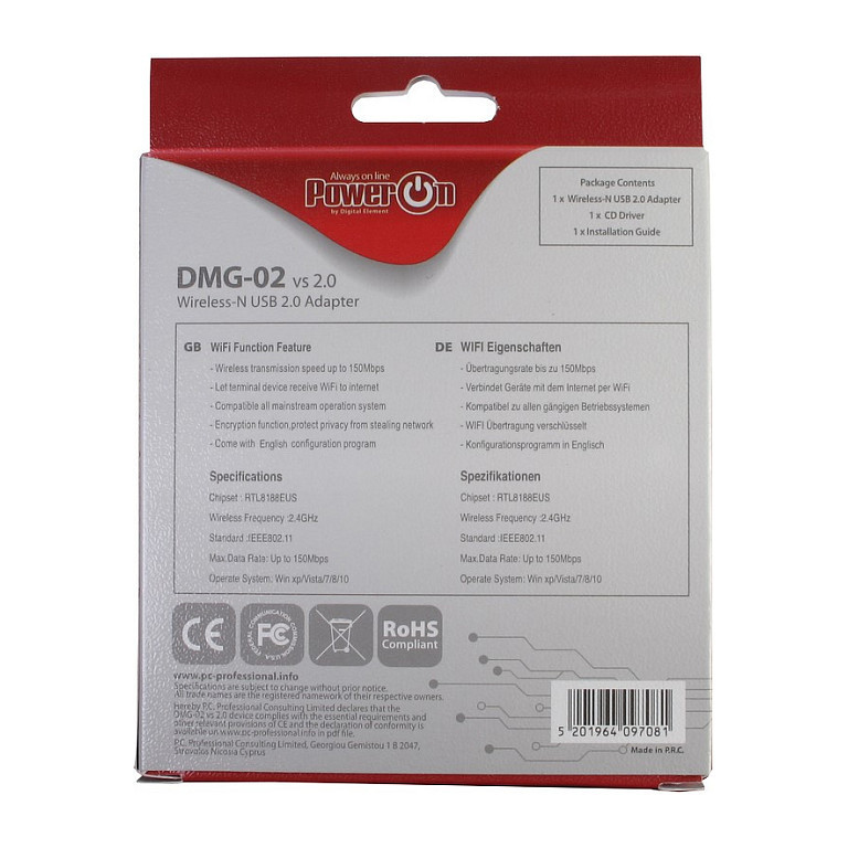 "Inter-Tech DMG-02. Connectivity technology: Wireless, Host interface: USB, Interface: WLAN. Maximum data transfer rate: 150 Mbit/s, Wi-Fi band: Single-band (2.4 GHz). USB powered. Product colour: White"\n"The DMG-02 enables your computer or laptop to connect to existing Wi-Fi network (802.11 n/b/g) with a transfer rate of up to 150 Mbps. It hits the excellent wireless connection and stable transfer rate although its nano size of 2cm.
