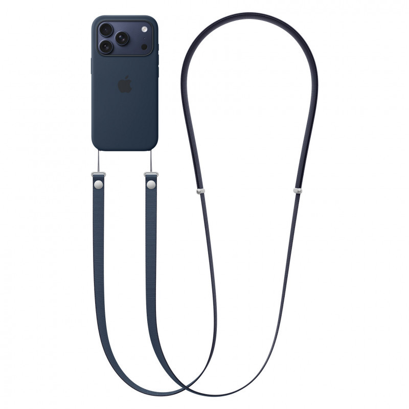 "Apple Crossbody Strap - Blue. Product type: Strap, Product colour: Blue, Material: Recycled polyethylene terephthalate (rPET), Stainless steel. Quantity per pack: 1 pc(s). Length: 2.08 m. Package width: 25 mm, Package depth: 92.2 mm, Package height: 190.3 mm"\n"The Crossbody Strap is designed to attach to selected Apple cases for a convenient and hands‑free way to wear iPhone.