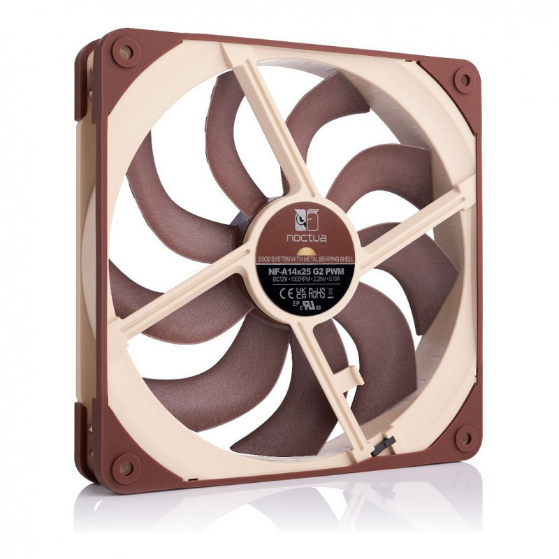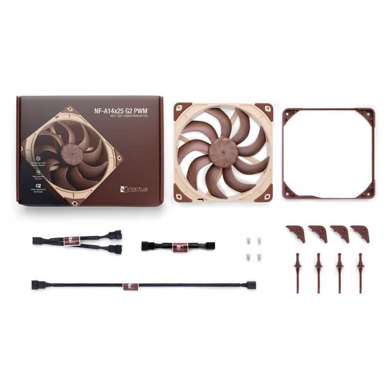 "Noctua NF-A14X25 G2 PWM. Type: Fan, Fan diameter: 14 cm, Rotational speed (max): 1500 RPM, Airflow: 155.6 m³/h, Bearing type: Self-Stabilising Oil-pressure Bearing (SSO). Voltage: 12 V. Width: 140 mm, Depth: 25 mm, Height: 140 mm. Product colour: Beige"\n"Succeeding the award-winning NF-A14 and building on the technological innovations of the ground-breaking NF-A12x25, the NF-A14x25 G2 is Noctua’s next-generation square-frame 140mm flagship model: Made from Sterrox® LCP, its highly optimised Progressive-Bend impeller with winglets, Flow Acceleration Channels and Centrifugal Turbulator hub combined with a tip-clearance of only 0.7mm allow the NF-A14x25 G2 to further improve its predecessor’s renowned quiet cooling performance. Like the NF-A14 and NF-A12x25, it is a true all-rounder that yields superb results in all types of usage, regardless of whether it’s in low-impedance, airflow-oriented applications such as case cooling, or high-impedance, static pressure demanding scenarios such as on heatsinks and water cooling radiators. For application-specific optimisation, the NF-A14x25 G2 comes with an NA-AVG2-LR anti-vibration gasket pre-installed to create a tighter seal on radiators. Additionally, its AAO (Advanced Acoustic Optimisation) frame can be combined with the optional NA-IS1-14 inlet spacer, which can help to achieve superior suction acoustics and flow rates in challenging intake configurations. The 4-pin PWM version supports fully automatic speed control via PWM fan headers and comes with a Low-Noise Adaptor to reduce the maximum speed from 1500 to 1250rpm. Its ultra-low-loss etaPERF™ motor with Smooth Commutation Drive 2 technology doesn’t only provide unprecedented energy efficiency and running smoothness, but thanks to the new SupraTorque™ feature, it can also leverage extra torque headroom to keep the fan at its desired speed when working against back pressure, thereby ensuring even better performance on heatsinks and radiators. Topped off with Noctua’s reference-class SSO2 bearing, a rich bundle of accessories and 6-year manufacturer’s warranty, the NF-A14x25 G2 is a premium-quality product through and through. Its superior performance, comprehensive feature set, cutting-edge construction and state-of-the-art materials set a new standard within Noctua’s portfolio and make it an elite choice for the most discerning demands."