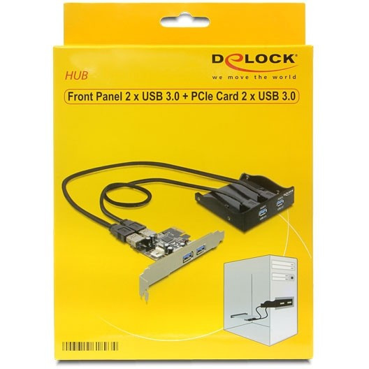 "DeLOCK Front Panel + PCI Express Card. Host interface: PCIe, Output interface: USB 3.2 Gen 1 (3.1 Gen 1). Product colour: Black. Cables included: USB. Data transfer rate: 5000 Mbit/s, Cable length: 0.6 m, Compatible operating systems: Windows XP/XP-64/Vista/Vista-64/7/7-64, Linux ex Kernel 2.6"\n"This USB 3.0 product by Delock expands your PC by four USB 3.0 interface. Insert the PCI Express card into a PCI Express slot and install the front panel into a free 3.5 bay of your PC. Thus you can use two USB ports in the front and two USB ports on the backside."