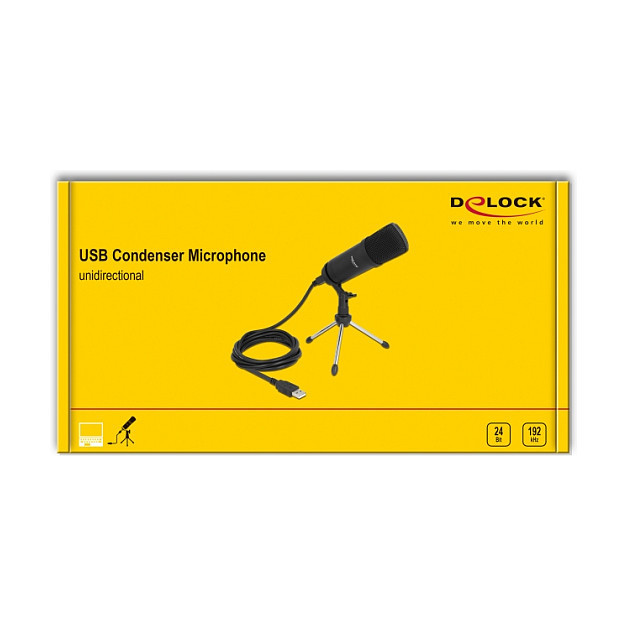 "DeLOCK Professional USB Condenser Microphone 24 Bit / 192 kHz for PC and Laptop. Microphone sensitivity: -38 dB, Microphone frequency: 30 - 16000 Hz, Sample rate: 192 kHz. Connectivity technology: Wired, Device interface: USB. Product colour: Black, Cable length: 2.5 m. Signal-to-Noise Ratio (SNR): 70 dB"\n"This professional USB condenser microphone by Delock can be used for high-quality voice and vocal recording, making it suitable for streaming, podcasting, gaming and video meetings.