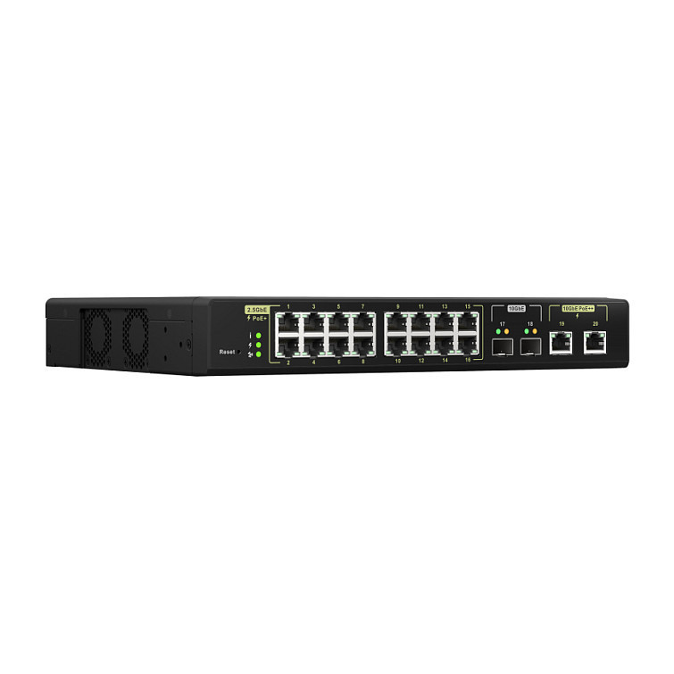 The QSW-M2116P-2T2S breaks through bandwidth limitations cabled and wireless networks to enhance your storage and access experience. With two 10GbE 90-watt and sixteen 2.5GbE 30-watt PoE ports, the QSW-M2116P-2T2S supplies up to a total power budget of 280 watts to meet the demands of high-power Wi-Fi 6 APs. With two 10GbE SFP+ ports for backbone network uplinking capability, the QSW-M2116P-2T2S provides an ultra-high-speed Wi-Fi 6 wireless network infrastructure solution for small-to-medium-scale businesses, hotels, and stores