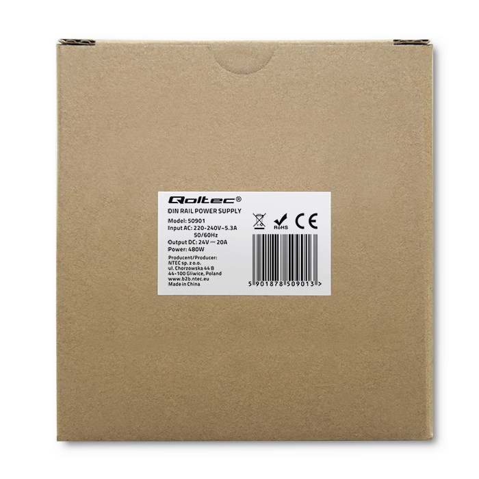 Qoltec 50901 Pramoninis maitinimo šaltinis, montuojamas ant DIN bėgelio | 480 W | 24 V | 20 A