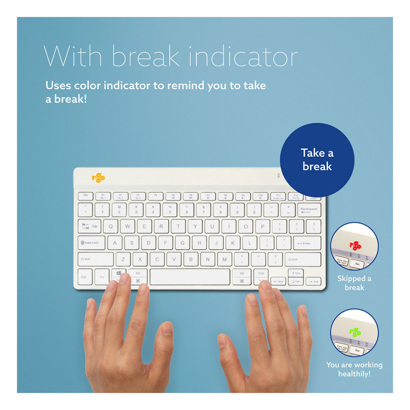 "R-Go Tools Ergonomic keyboard R-Go Compact Break, compact keyboard with break software, QWERTY (US), Bluetooth, white. Keyboard form factor: Mini. Keyboard style: Straight. Connectivity technology: Wireless, Device interface: Bluetooth, Keyboard key switch: Scissor key switch, Keyboard layout: QWERTY. Cable length: 1.55 m. Recommended usage: Office. Product colour: White"\n"This compact keyboard has all the ergonomic features you need for healthy typing. The compact design ensures that your hands always remain within shoulder width when using the keyboard and mouse simultaneously. The light keystrokes reduce muscle tension while typing. The keyboard is ultra-thin, so your hands and wrists remain in a relaxed, natural position while typing. This improves blood circulation in your hands. The R-Go Compact Break keyboard uses LED colour signals to indicate when it is time to take a break. While typing, the light changes colour, like a traffic light. When the light is green, it means you are working healthily. Orange indicates that it is time for a short break and red means that you have been working too long. By taking short breaks during your working day, you will increase your concentration, prevent strain and stay fit during your working day.This product works in combination with the R-Go Break Software, which won the Benelux Office Products Award 2021."
