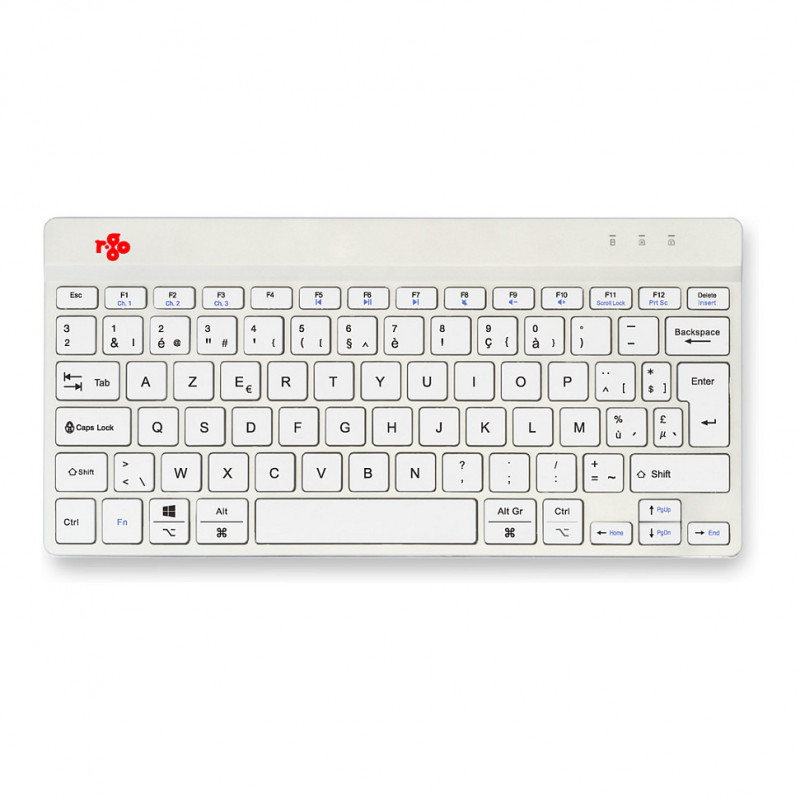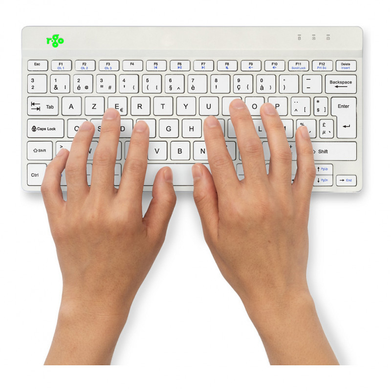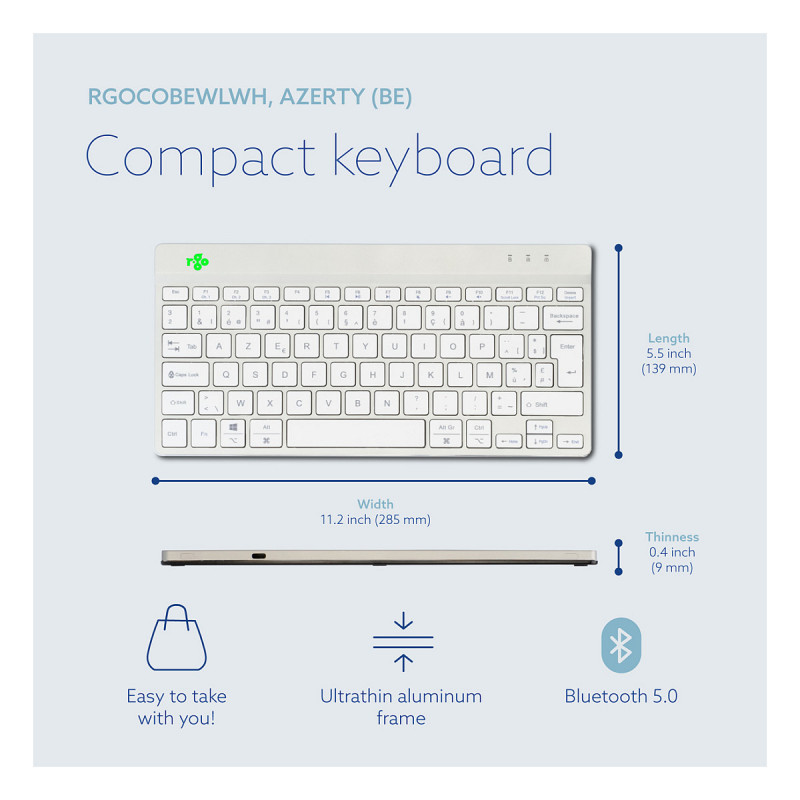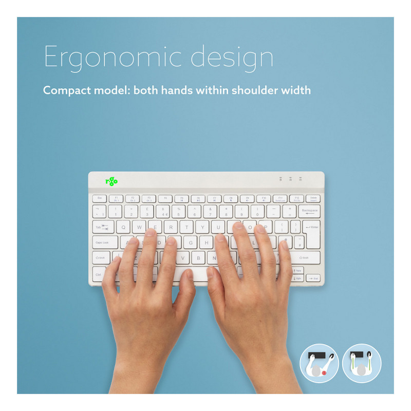 "R-Go Tools Ergonomic keyboard R-Go Compact Break, compact keyboard with break software, AZERTY (BE), Bluetooth, white. Keyboard form factor: Mini, Connectivity technology: Wireless, Device interface: Bluetooth, Keyboard key switch: Scissor key switch, Keyboard layout: AZERTY. Cable length: 1.55 m. USB hub, Recommended usage: Office. Product colour: White"\n"This compact keyboard has all the ergonomic features for healthy typing. The compact design ensures that your hands always remain within shoulder width when using keyboard and mouse simultaneously. The light keystroke reduces muscle tension while typing. The keyboard is ultra thin, so your hands and wrists are in a relaxed, natural position while typing. This ensures better blood flow to your hands. The R-Go Compact Break keyboard indicates with LED colour signals when it is time to take a break. As you type, the light changes colour, like a traffic light. When the light turns green, it means you are working healthily. Orange indicates it is time for a short break and red that you have been working too long. Taking short breaks during your working day will increase your concentration, prevent strain injuries and keep you fit during your working day. This product works together with the R-Go Break Software that won the Benelux Office Products Award 2021."