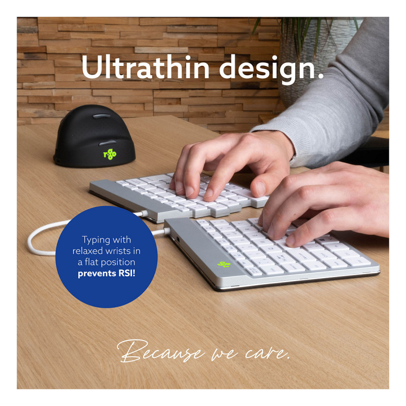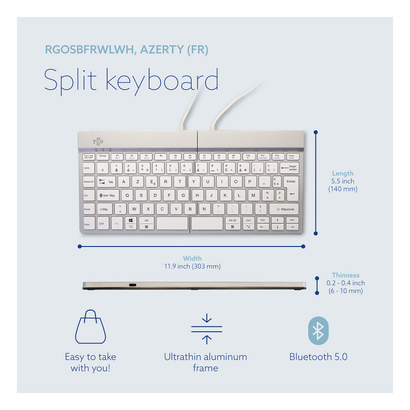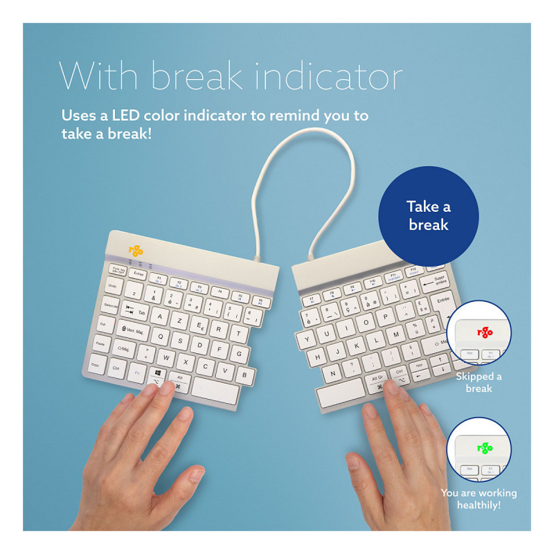 "R-Go Tools Ergonomic keyboard R-Go Split Break with break software, ergonomic split keyboard, AZERTY (FR), Bluetooth, white. Keyboard form factor: Mini. Keyboard style: Straight. Connectivity technology: Wireless, Device interface: Bluetooth, Keyboard key switch: Scissor key switch, Keyboard layout: AZERTY. Cable length: 1.02 m. Recommended usage: Office. Product colour: White"\n"The R-Go Split Break keyboard is an ergonomic split keyboard with integrated break software. This keyboard encourages you to take regular breaks. This keeps your body's blood flowing, prevents strain and keeps you fit during your working day. The keyboard consists of two separate parts, which you can place in any arrangement you like. This splitting prevents a kink in the wrists while typing. Typing with straight wrists reduces muscle tension and prevents pinching of tendons and blood vessels. The built-in magnet allows you to turn the two separate parts of the keyboard into a compact keyboard with one move. The compact size ensures that the mouse is always within reach. The light keystroke means minimal muscle tension is present while typing. The keyboard is flat, keeping your hands and wrists flat and relaxed while typing. LED colour signals in the keyboard indicate how healthy you are working and when it is time for a break. As you type, the light changes colour, like a traffic light. Green means ‘good job’, orange that it is time for a break, red that you have been working too long. Through these subtle colour signals, you receive feedback on your pause behaviour in a simple and positive way. This product works with the R-Go Break Software that won the Benelux Office Product Award 2021."