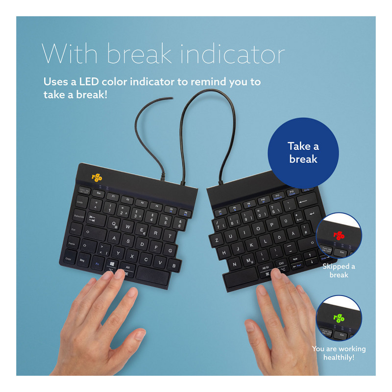 "R-Go Tools Ergonomic keyboard R-Go Split Break v2 with break software, ergonomic split keyboard, QWERTZ (DE), Wired, black. Keyboard form factor: Mini. Keyboard style: Straight. Connectivity technology: Wired, Device interface: USB, Keyboard key switch: Scissor key switch, Keyboard layout: QWERTZ. Cable length: 1.5 m. Recommended usage: Universal. Product colour: Black"\n"The R-Go Split Break keyboard is an ergonomically split keyboard with integrated break software. This keyboard encourages you to take regular breaks. This keeps your blood circulation flowing, prevents strain and keeps you fit during your working day.The keyboard consists of two separate parts that can be placed in any desired configuration. This split design prevents your wrists from bending while typing. Typing with straight wrists reduces muscle tension and prevents pinching of tendons and blood vessels. The built-in magnet allows you to convert the two separate parts of the keyboard into a compact keyboard with a single movement. The compact size ensures that the mouse is always within reach. The light keystrokes minimise muscle tension while typing. The keyboard is flat, keeping your hands and wrists flat and relaxed while typing.The LED colour signals in the keyboard indicate how healthy you are working and when it is time for a break. While typing, the light changes colour, like a traffic light. Green means “good going”, orange means it's time for a break, and red means you've been working too long. These subtle colour signals provide you with simple and positive feedback on your break behaviour. This product works in conjunction with the R-Go Break Software, which won the Benelux Office Product Award 2021."